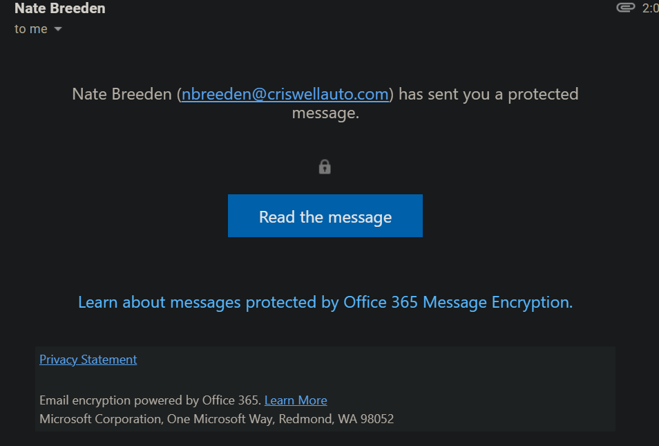- If the email is internal or the recipient is using a Microsoft email service, the message will be decrypted in the recipient’s inbox, meaning they will be able to read the email without any additional steps. Below is an example of what an internal email looks like that has been encrypted, please notice the “lock” icon and the “encrypted” message on the top