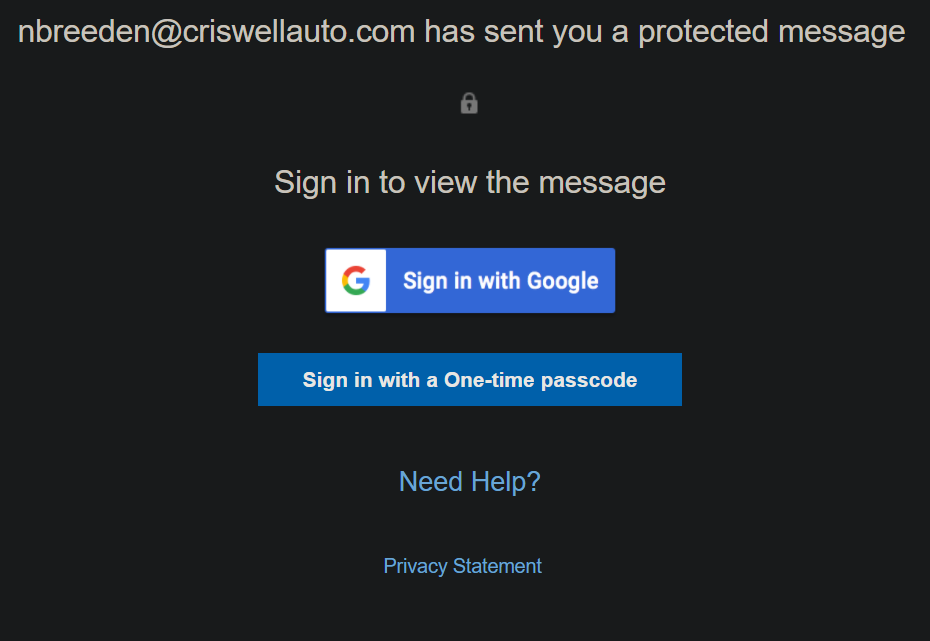 - If the email is external and not an O365/Outlook client, the email will come through like the below screenshot (Screenshot1). The recipient will need to click the link in the email, authenticate using their credentials or request a one-time passcode (Screenshot2), then they will be able to view the email