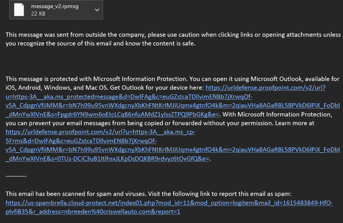 - If the recipient is using a Microsoft email system and is external (non-Criswell email address), when they reply there is a good chance Microsoft will not decrypt the message properly (example message below). If you see something like the below message, you will need to ask the person replying to send a separate message outside of the encrypted message, or you can download the “AIP Viewer” app on your phone, then open the attachment on your Apple/Android to read the reply. We are working on resolving this issue, but Microsoft has recommended the phone app as a work-around.